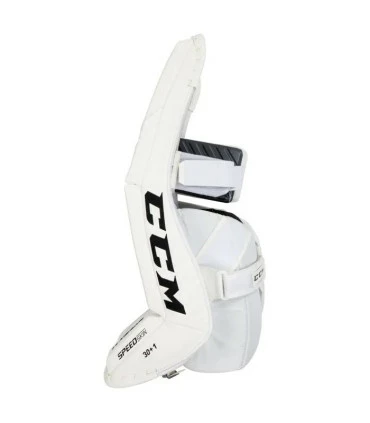Les jambières CCM EFlex 5.9 sont enveloppées dans le matériau exclusif SpeedSkin de CCM. SpeedSkin est tout aussi épais et durable